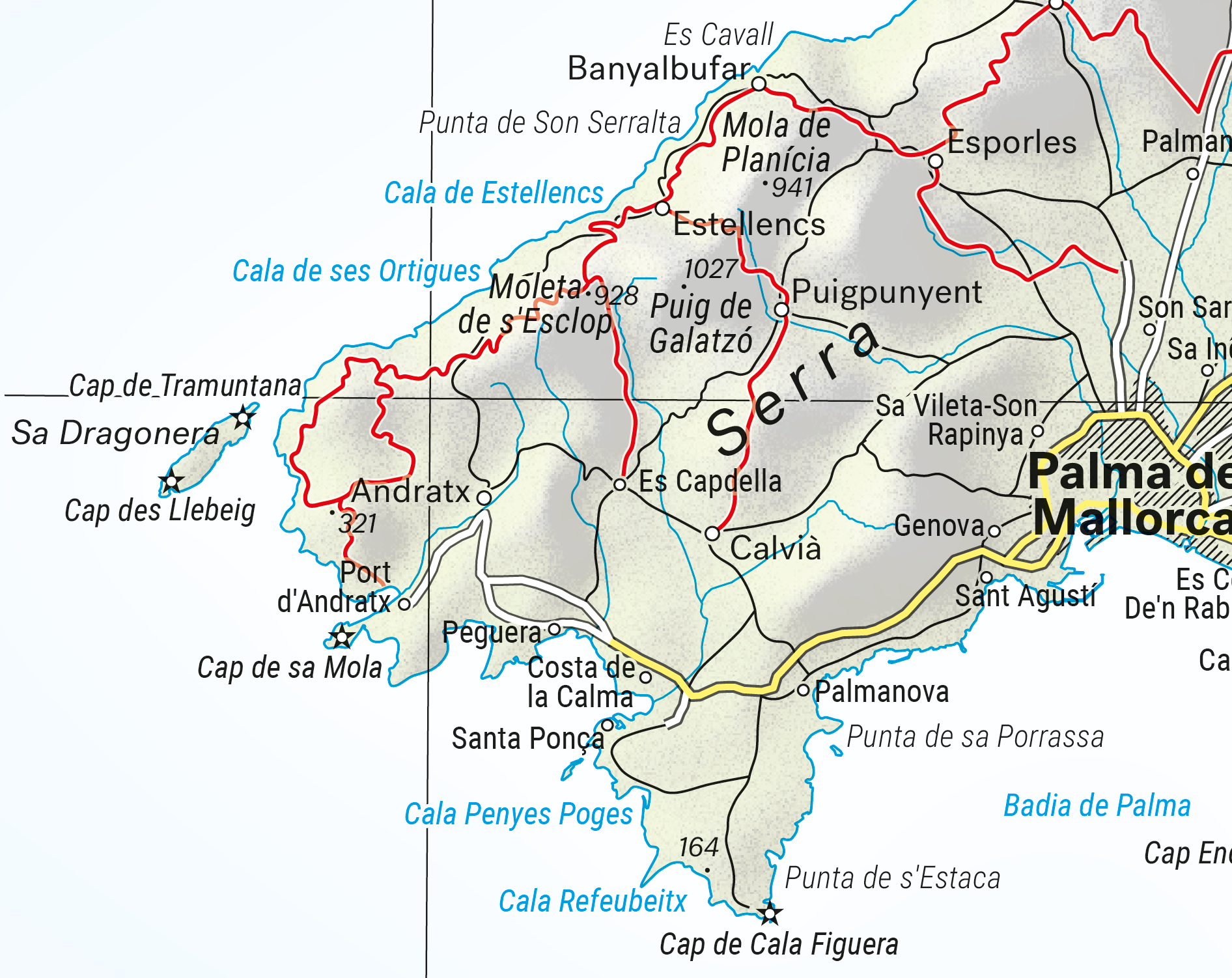 Här är en karta jag gjort över Mallorca. Kartan användes i en bok om vandring på Mallorca. Syftet med kartan är att visa vandringslederna i bergskedjan Serra de Tramuntana.